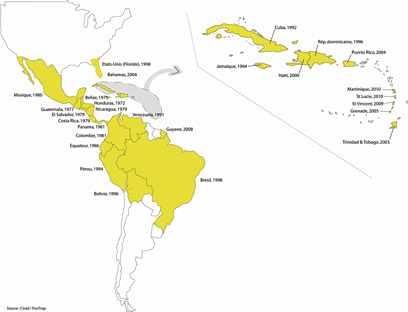 Originally from Southeast Asia, genetic studies of the pathogen suggest that the fungus was carried to other continents in infected plant material. The first observation in Latin America dates back to 1972 in Honduras (see figure). The fungus quickly colonized all of central America before entering the North and South American continents. It then jumped to the Caribbean, arriving in Cuba in the early 1990s. Its arrival in Trinidad in 2003 opened up the front that is now threatening Dominica and Guadeloupe.