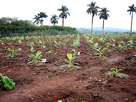 In Uganda, over 200 genetically modified Gros Michel banana plants are being field-tested for their resistance to Black leaf streak, a fungal disease that attacks the leaves and lowers yields by interfering with photosynthesis.
