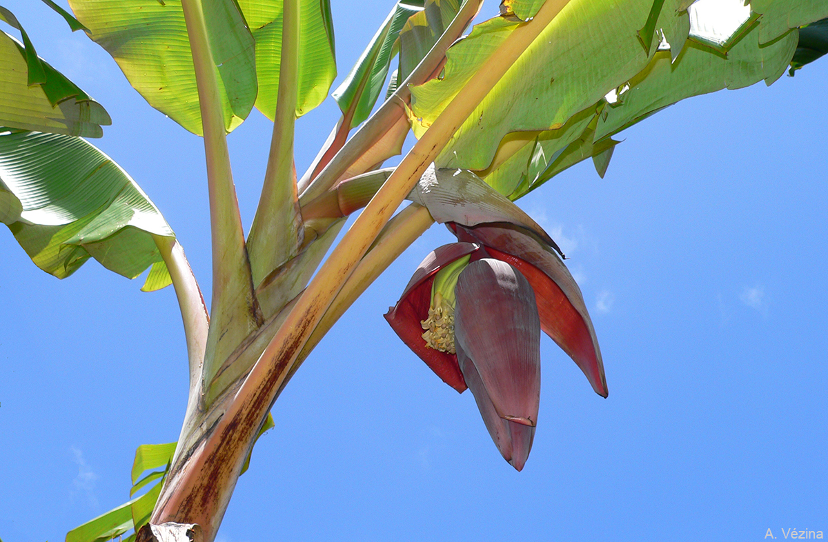 The underside of the cigar leaf is mauve, silvery, coppery, reddish or bronze-coloured, not to be confused with Mysore bananas, which also have pink on the underside of their leaves. The colour normally fades within a week but may persist for months. Some cultivars have this colour on the undersides of most leaves. The petiole has erect or slightly incurved margins.