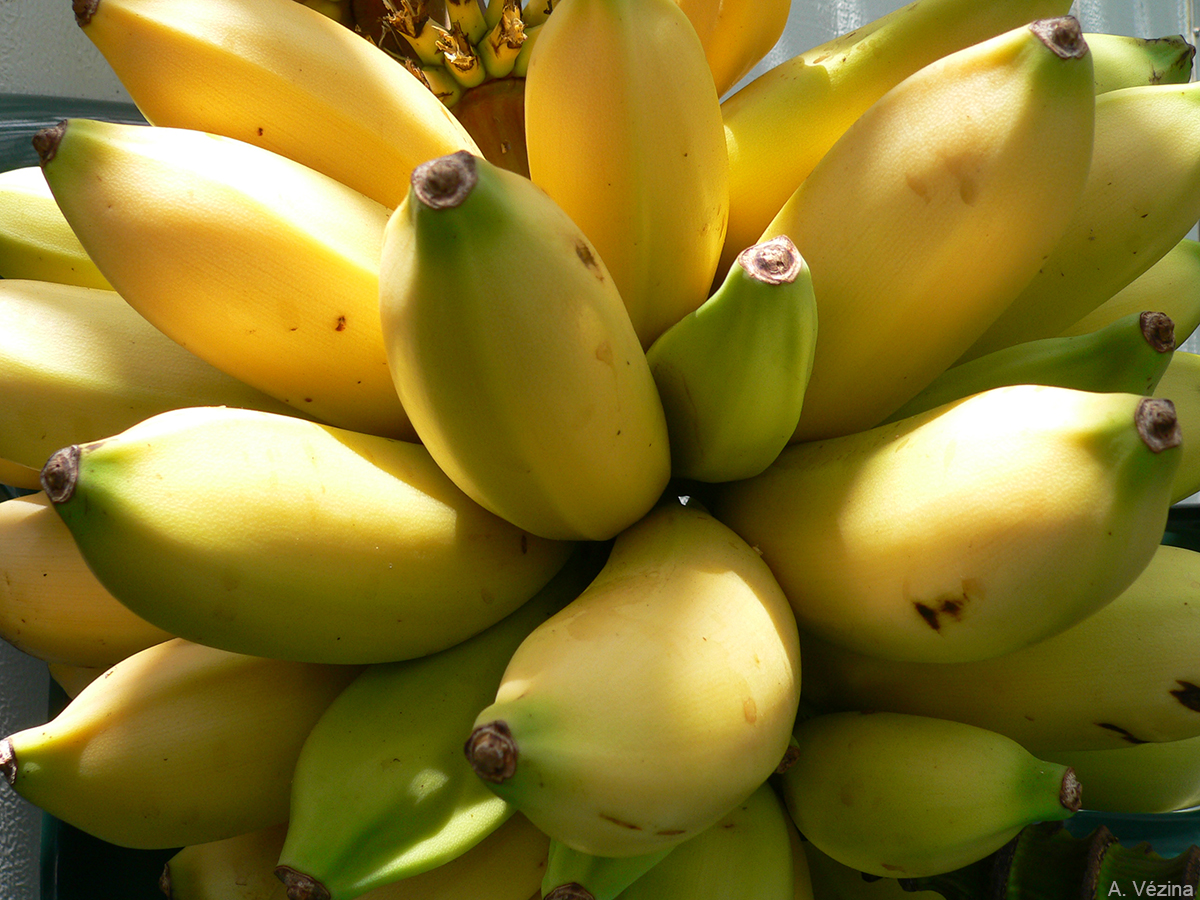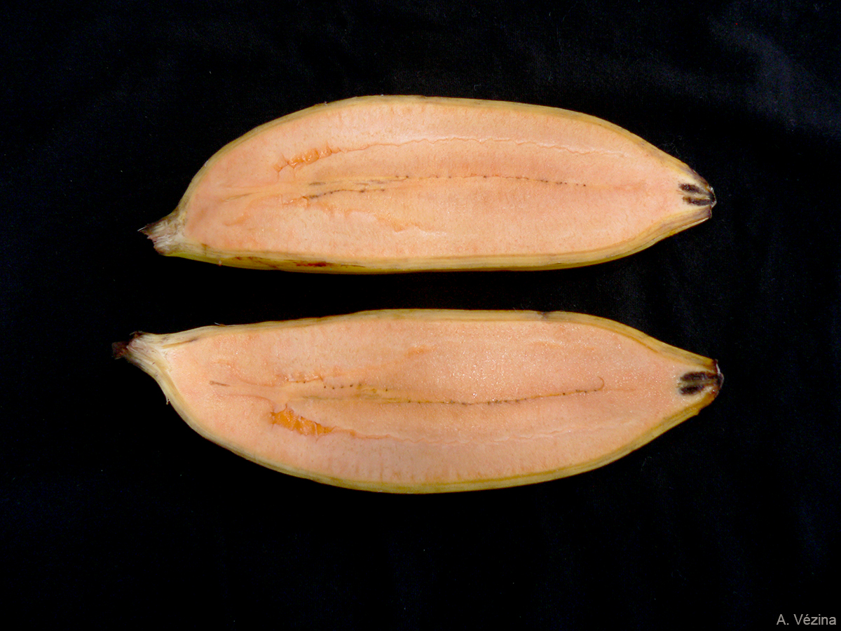 The rachis is typically bare. The bunch is small to medium-sized. The fruit turn yellow early, when the pulp is still firm. At that stage, the fruit may require another 2 to 3 weeks on the plant to reach maturity. This trait may have contributed to their neglect.