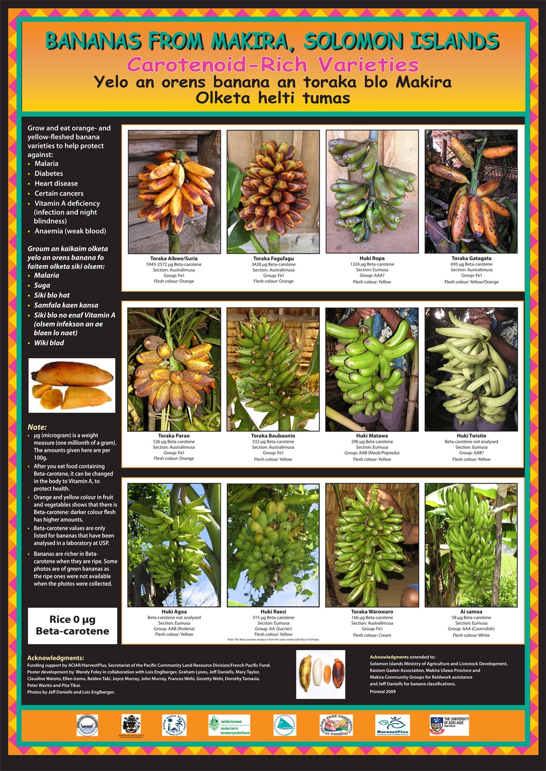 Some Micronesians mentioned how Karat bananas used to be a traditional infant food10 . Lois sent out samples of the orange-fleshed banana for analysis. The results showed that the Karat banana is rich in beta-carotene. It was the first time banana cultivars had been scientifically shown to being rich in precursors of vitamin A11 .