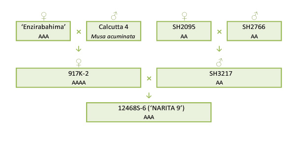 Two crosses were performed to obtain ‘NARITA 9’. The triploid EAHB cultivar ‘Enzirabahima’ was crossed with a wild source of disease resistance to produce a tetraploid. This tetraploid was then crossed with an improved diploid to produce the triploid hybrid ‘NARITA 9’ (see Breeding strategy below).