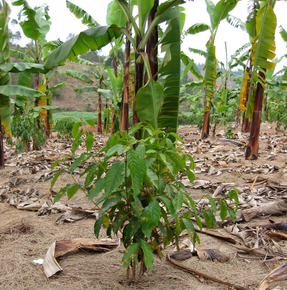 Uganda is the largest producer of bananas after India and the second largest producer of coffee in Africa. To feed the demand for these crops, most Ugandan farmers grow them in monocultures, but sometimes the crops are also mixed, especially in highly populated areas. According to the information provided by farmers as part of a USAID-funded study done by the International Institute of Tropical Agriculture (IITA), intercropping banana with coffee is more profitable than growing either crop as a monoculture.In the Arabica-growing region of Mt Elgon, annual returns per hectare on mixed farms averaged 4,356 USD compared to 1,533 USD and 2,364 USD for banana and coffee monocultures respectively. In western Uganda, the returns to farmers tending Robusta coffee fields were lower, but still higher when bananas were intercropped with coffee (1,827 USD) than when bananas or coffee were grown alone (1,177 and 1,286 USD respectively). Since coffee yields were essentially the same in both systems, the extra revenues came from adding banana plants. IITA scientists recommend planting two coffee trees for each banana plant.